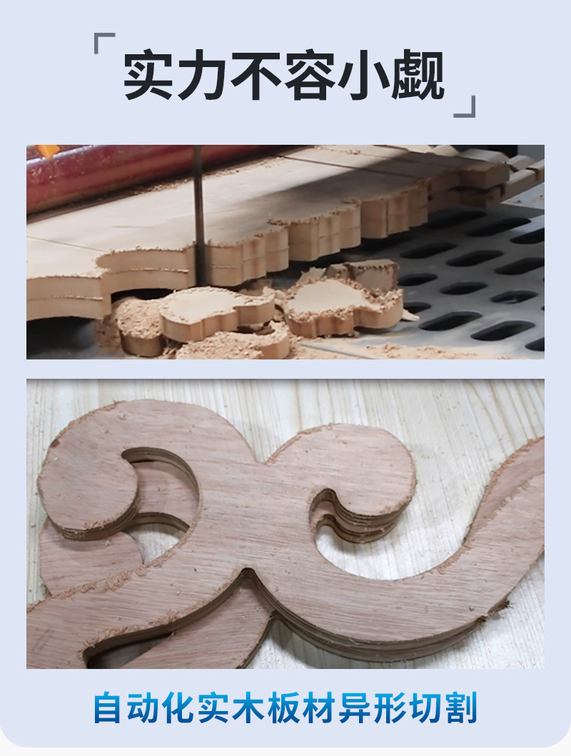 2.斷面光潔、加工精度高、速度快,代替傳統帶鋸切屑死角和拐彎難題以及表面光澤度問題,顛覆傳統實木下料前段工序、畫線、手動開料、 鑼銑三道工序,降低人工成本,降低生產事故,提高生產效率。