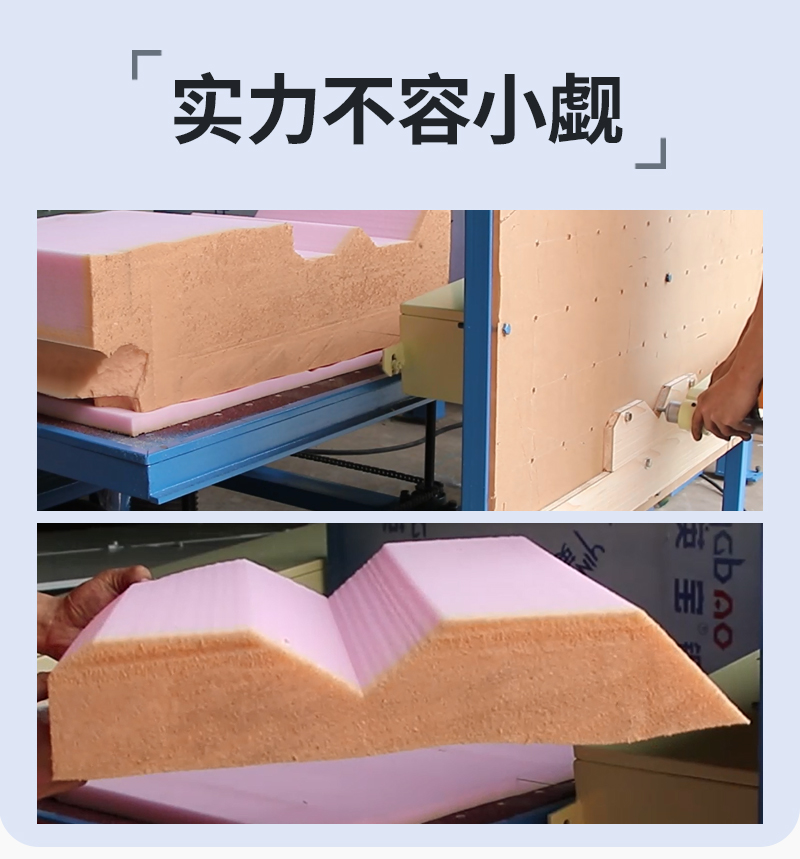 1.本機用于特殊形狀的泡綿加工切片工作,利用預先制作的不同形狀模具,可完成圓柱、圓弧、枕頭等特殊形狀的加工。