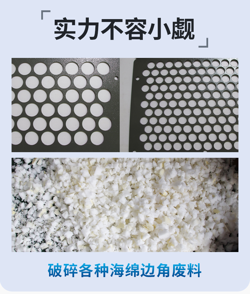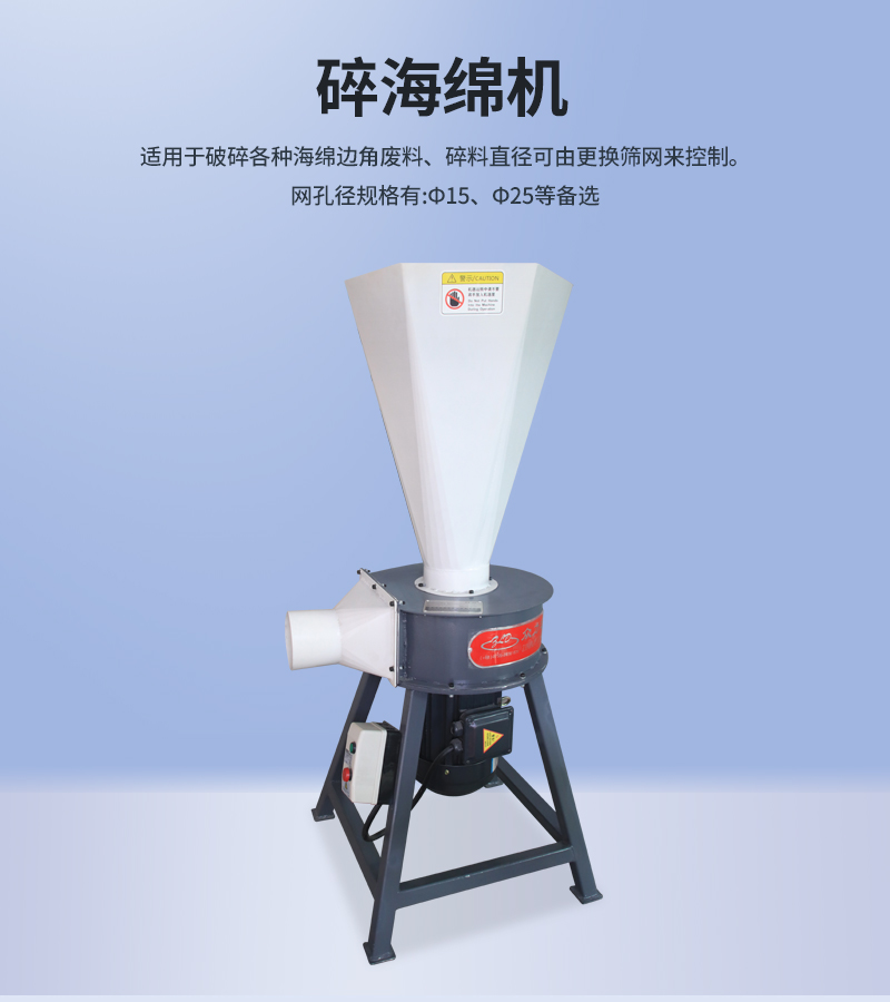 1.適用于破碎各種海綿邊角料,碎料直徑可由更換篩網來控制,篩網孔徑規格有Φ15、Φ25等備選(本機只配一種,也可以根據客戶的要求定做)。