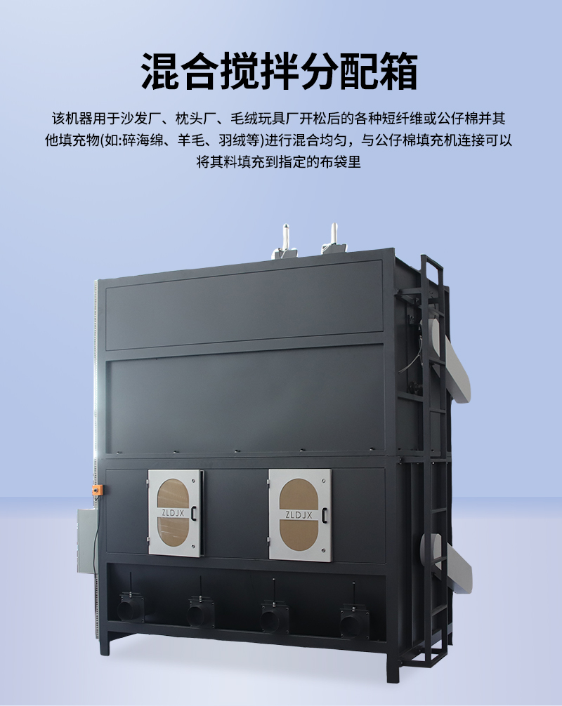 1.混合攪拌分配箱適用于沙發(fā)廠、枕頭廠、毛絨玩具廠開(kāi)松后的各種短纖維或公仔棉并其他填充物(如碎海綿、羊毛、羽絨等)進(jìn)行混合均勻,