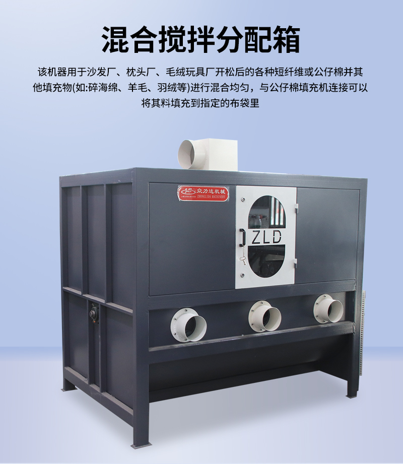 1.混合攪拌分配箱適用于沙發(fā)廠、枕頭廠、毛絨玩具廠開(kāi)松后的各種短纖維或公仔棉并其他填充物(如碎海綿、羊毛、羽絨等)進(jìn)行混合均勻,