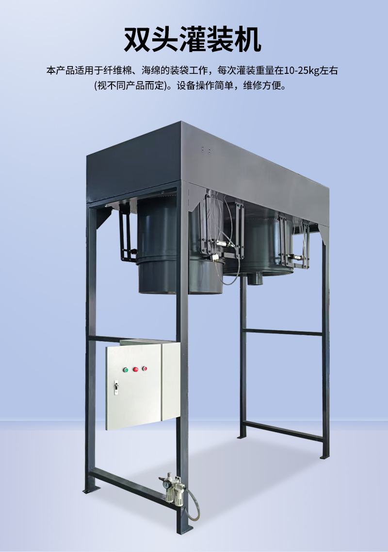 1.灌裝機適用于纖維棉、海綿的裝袋工作,每次灌裝重量在10-25kg左右(視不同產品而定)。
