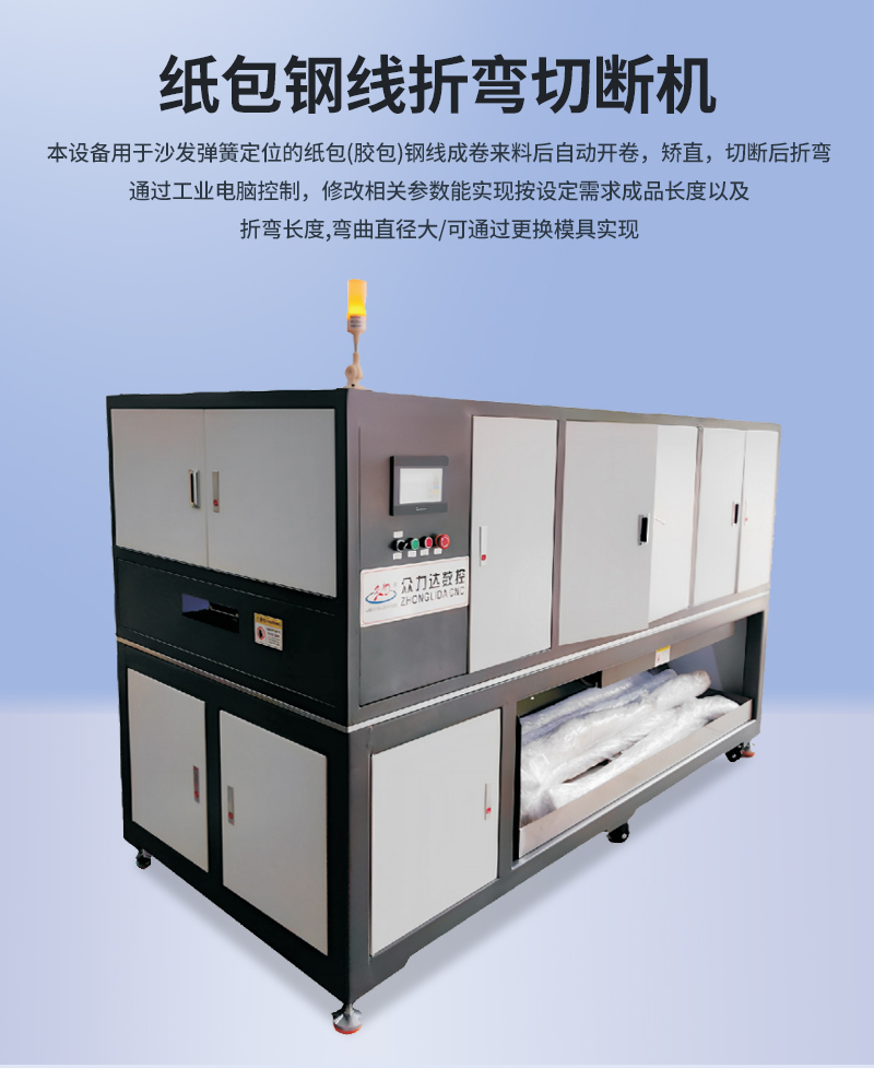 1.該設(shè)備主要用于沙發(fā)廠紙包鋼絲(膠包鋼絲)的自動(dòng)切斷折彎,實(shí)現(xiàn)多線同步自動(dòng)送料,精度高、操作簡(jiǎn)單。